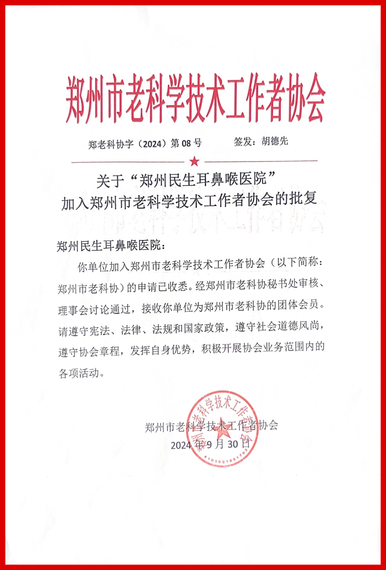 【喜报】郑州民生耳鼻喉医院正式成为郑州市老科学技术工作者协会会员单位