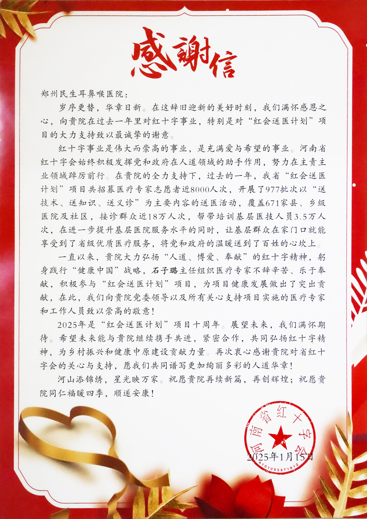 岁末年初,感恩同行。在这个辞旧迎新的美好时刻,郑州民生耳鼻喉医院收到了一份充满荣誉与肯定的“新年礼物”——河南省红十字会的感谢信。这封信中,红十字会高度评价我院在2024年度“红会送医计划”中的突出表现,充分肯定了我院为基层医疗健康事业做出的积极贡献。