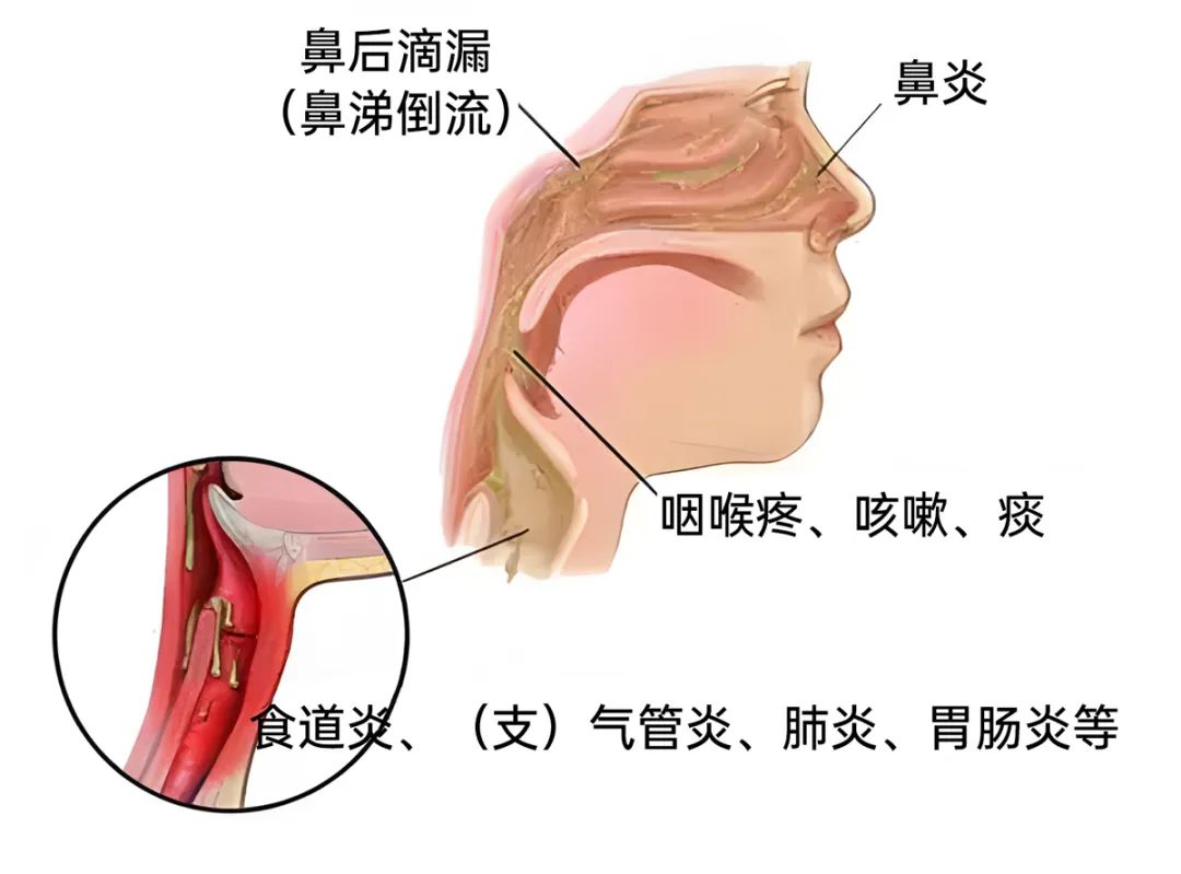 鼻腔和咽喉的黏膜下布满了分泌黏液的腺体,正常情况下,这些黏液会自然流向喉咙并被吞咽。但当鼻腔、鼻窦发炎时,黏膜纤毛功能受损,分泌物增多且无法正常排出,大量向后流入咽喉,刺激咳嗽感受器,进而导致咳嗽不止。