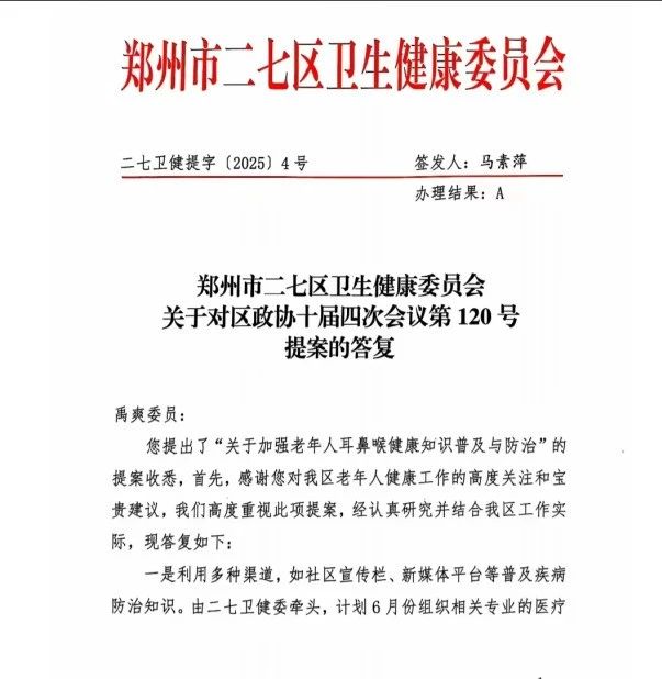 随着我国老龄化程度加深,中老年人耳鼻喉疾病发病率逐年上升,但由于健康意识薄弱、就诊率低,许多患者往往延误治疗,严重影响生活质量。作为二七区政协委员,禹爽院长立足专业领域,在提案中强调:“耳鼻喉健康是中老年人生活质量的重要保障,加强科普教育、提升基层筛查能力,是减少疾病负担的关键。”该提案得到二七区卫健委的迅速响应。