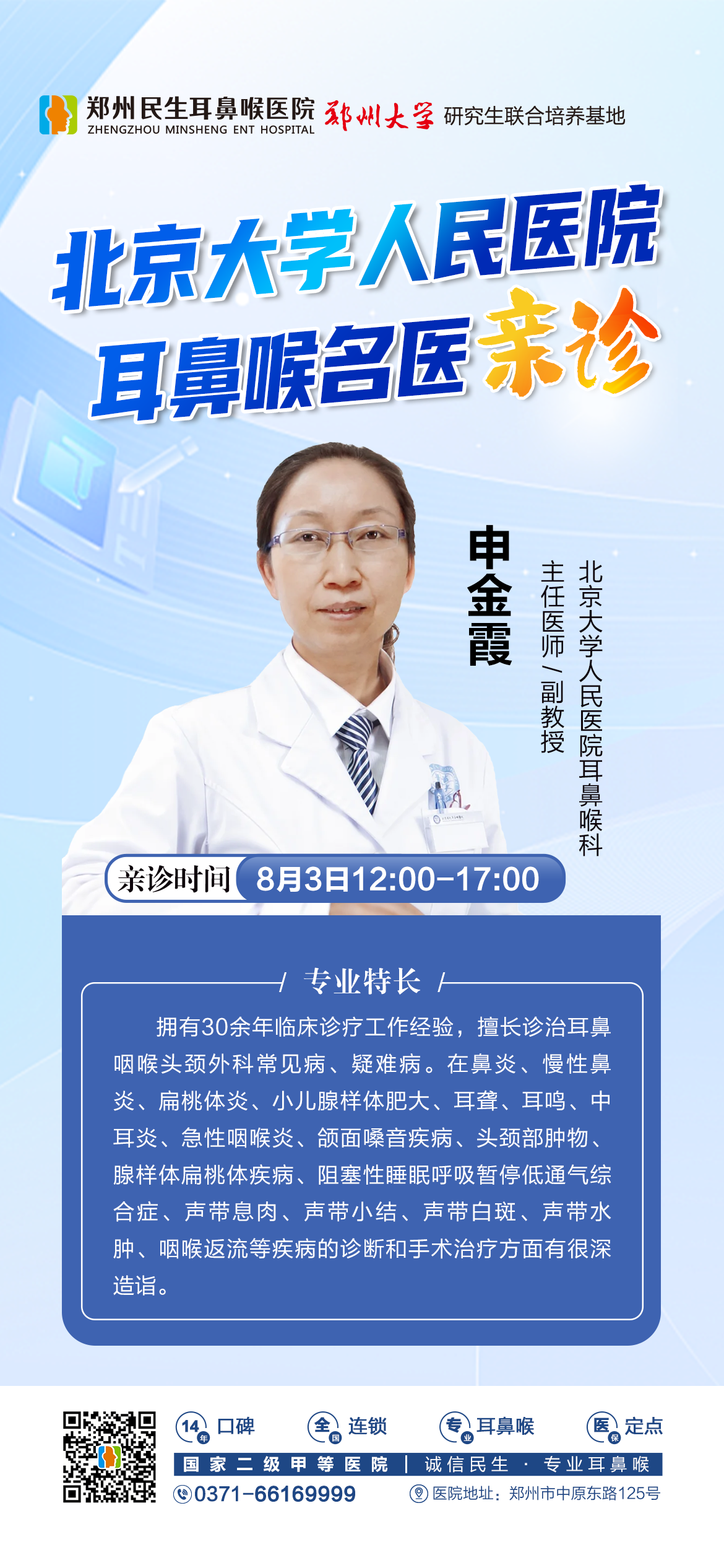 随着暑期时光悄然过半,您是否依然为耳鼻喉问题忧心忡忡?为了让郑州及周边群众无需远行,即可享受国内顶尖医疗资源,解决那些影响您生活质量的耳鼻喉难题,郑州民生耳鼻喉医院特邀【北京大学人民医院】权威专家——申金霞教授,于8月3日(下周六)下午12:00至17:00来郑亲自会诊。仅此半天,提前预约,先到先得,欢迎广大耳鼻喉疑难病症患者前来就诊咨询。