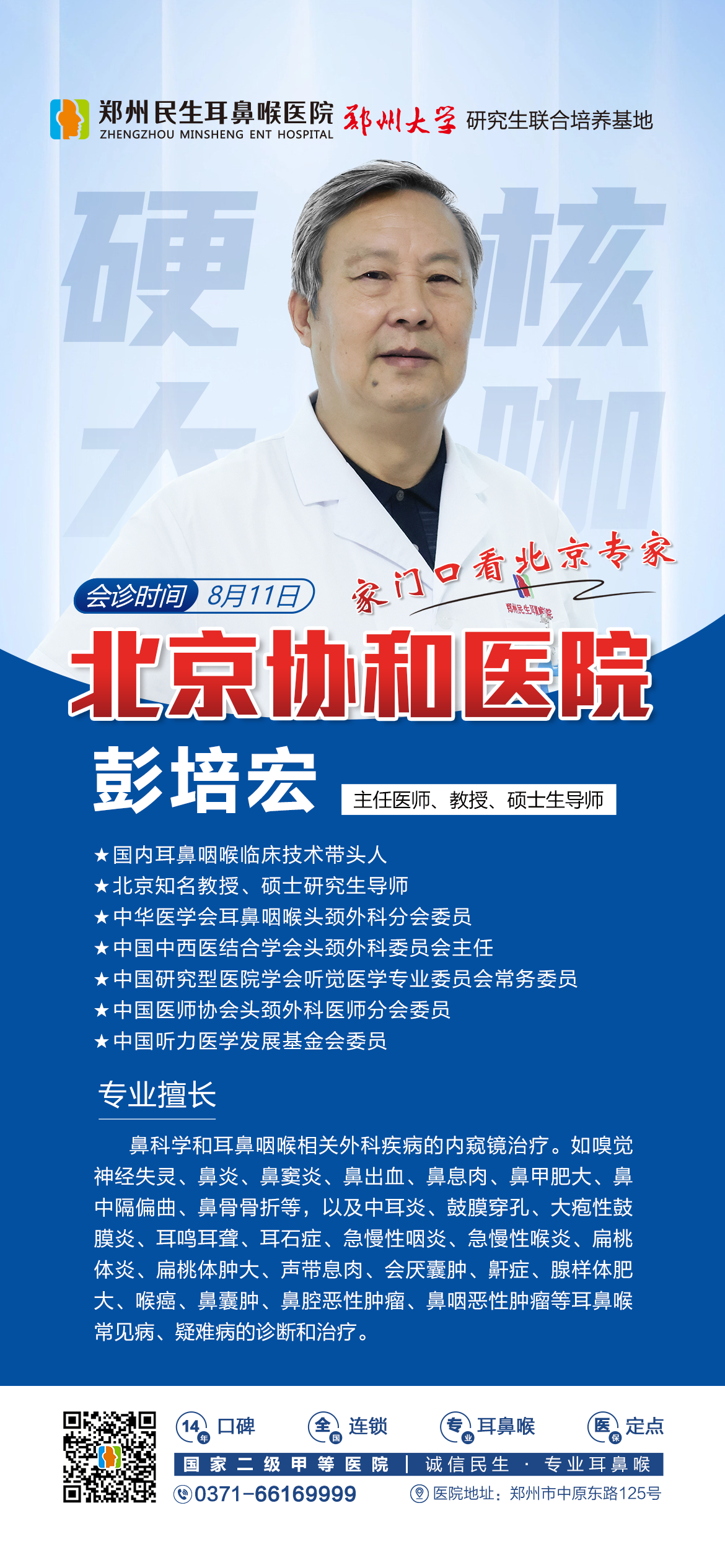 8月11日(本周日),北京协和医院河南籍知名耳鼻喉专家——彭培宏教授,受邀再次亲临郑州民生耳鼻喉医院,开展“耳鼻喉专家故乡行”专家会诊活动。仅此1天,提前预约,先到先得,欢迎广大耳鼻喉患者前来就诊咨询。