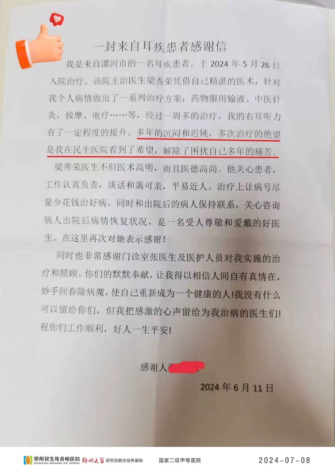 “我是来自漯河市的一名耳疾患者。于2024年5月26日入院治疗。郑州民生耳鼻喉医院主治医生梁秀荣凭借自己精湛的医术,针对我个人病情做出了一系列治疗方案:口服药、输液、中医针灸,按摩、电疗......”