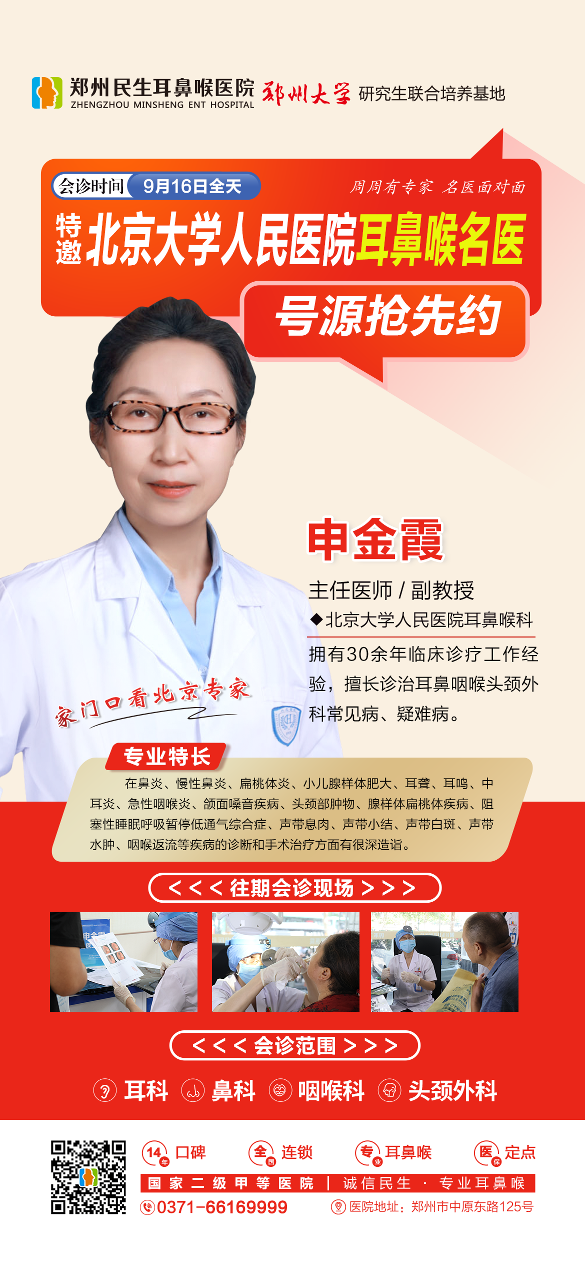 为了让郑州及周边地区的居民无需长途跋涉,即可在家门口享受到北京专家的顶级医疗服务,从而让患者好看病、看好病,郑州民生耳鼻喉医院特邀【北京大学人民医院】权威专家——申金霞教授,于9月16日(周一)亲临我院,开展为期一天的联合会诊及教学查房活动。