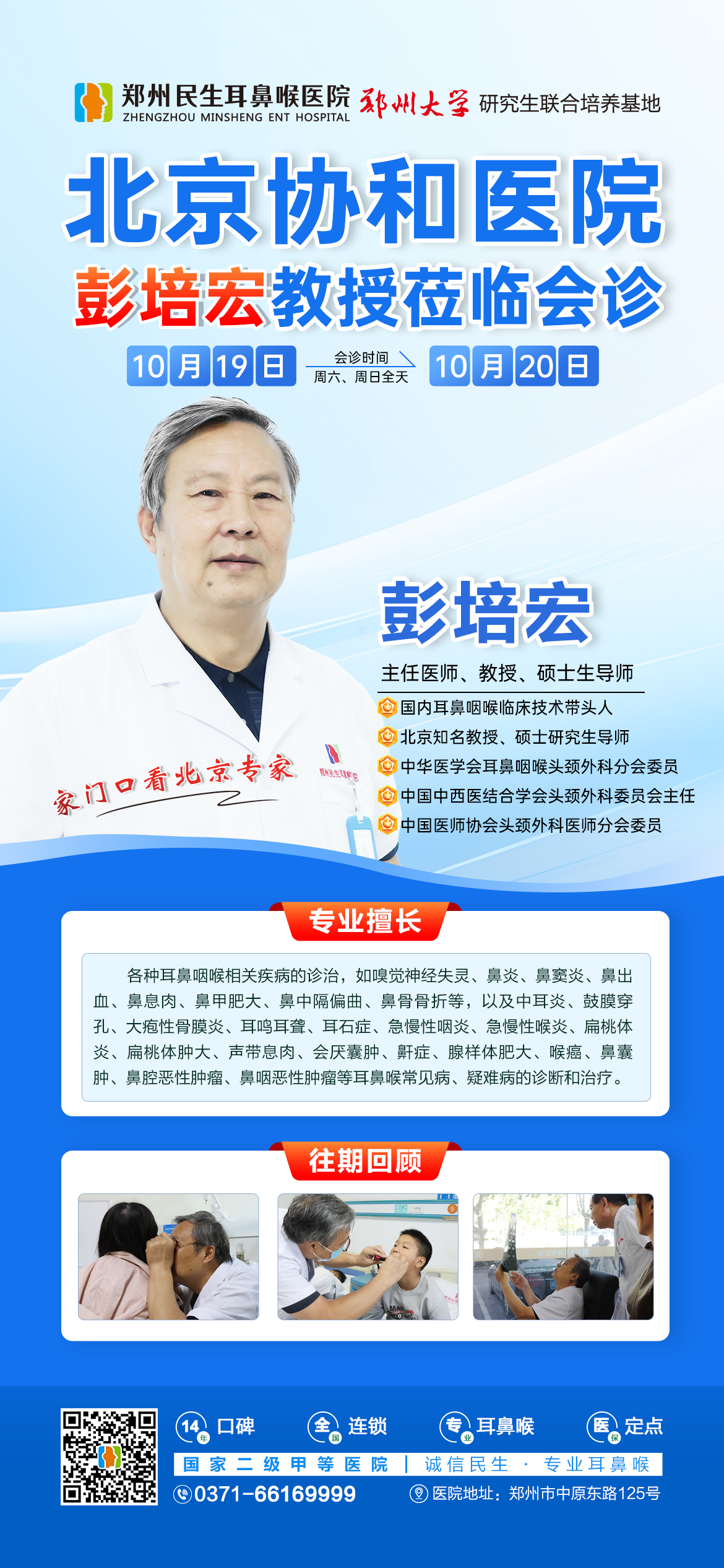 为了给耳鼻喉患者提供优质、高效的医疗服务,解决患者赴京看病难、看病贵的实际问题,让郑州及周边地区居民在家门口就能体验北京专家的优质服务,郑州民生耳鼻喉医院于10月19日、20日(周六、周日)特邀北京协和医院河南籍知名耳鼻喉专家彭培宏教授亲临我院,开展专家会诊及教学查房活动。