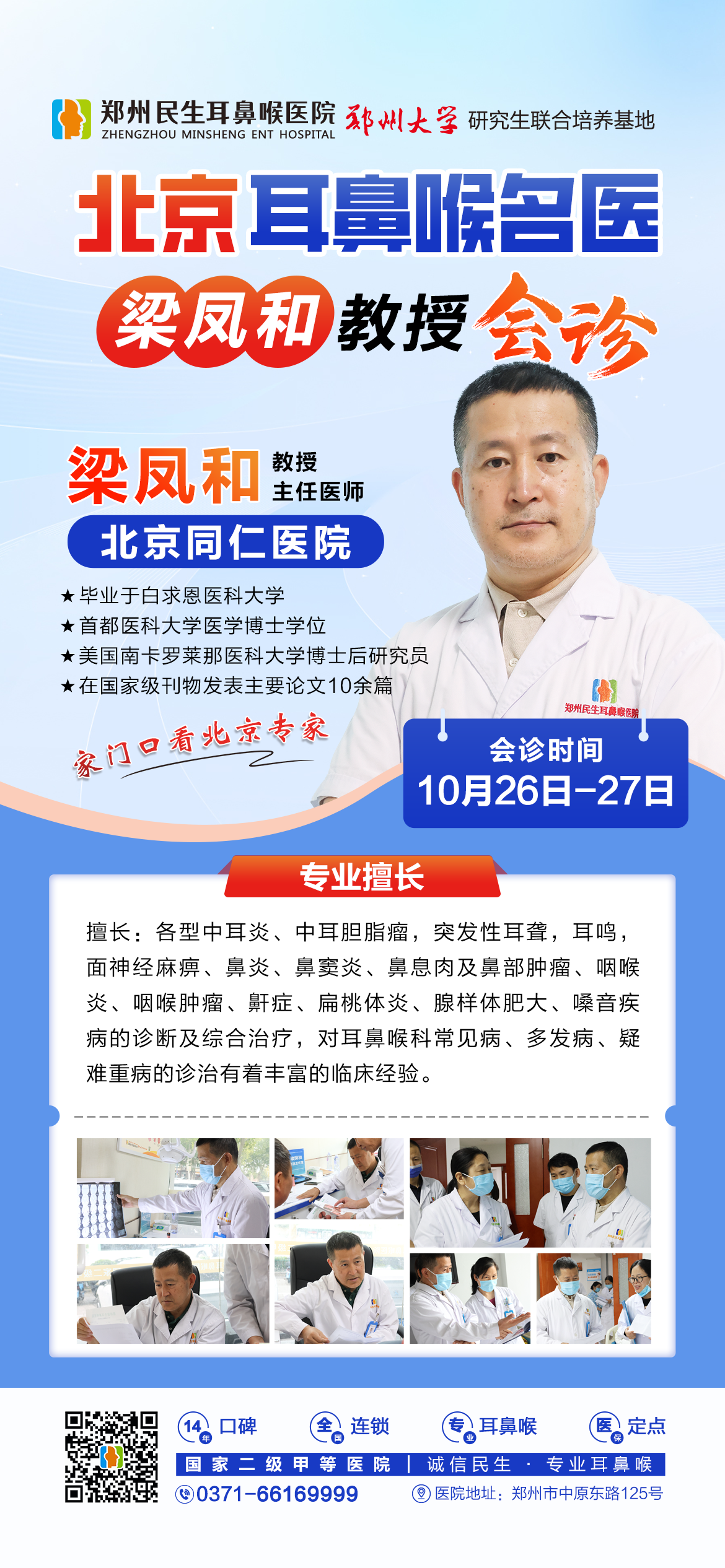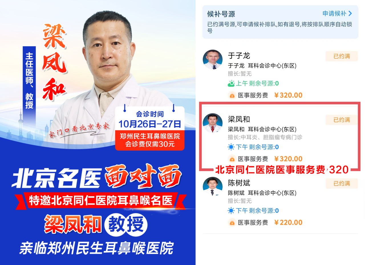 为了满足广大群众日益增长的就医需求,为就诊患者提供高效、便捷、面对面的北京专家医疗服务,郑州民生耳鼻喉医院于10月26日、27日(周六、周日)特邀北京同仁医院梁凤和教授来院教学查房、会诊,让您足不出户就能享受到北京知名专家的优质服务。欢迎广大耳鼻喉患者咨询预约。