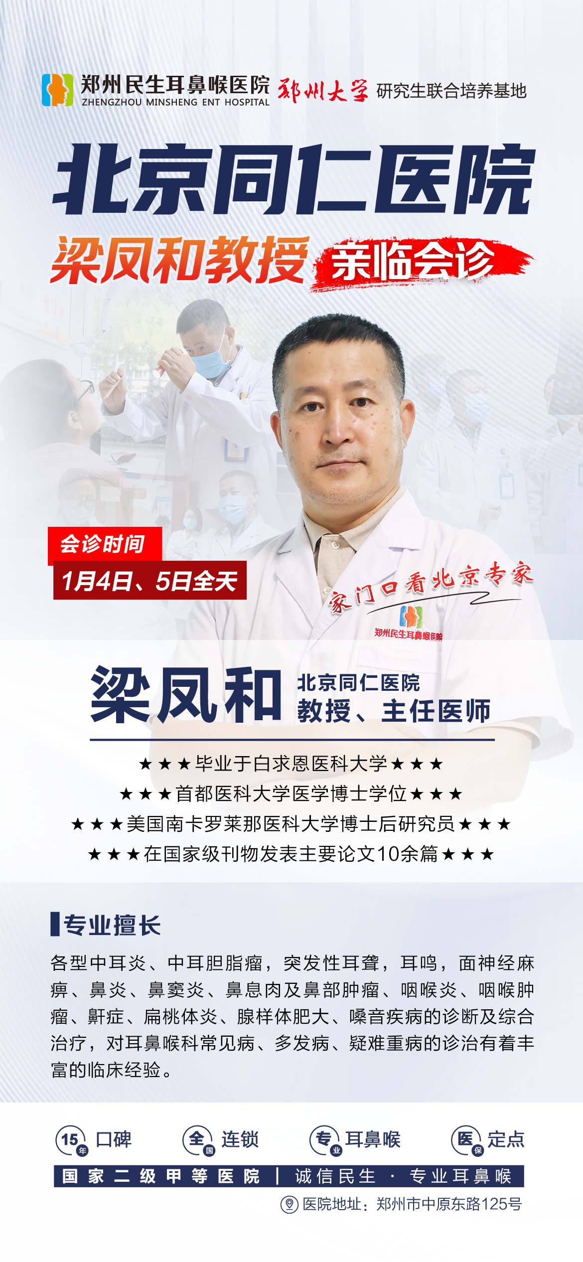 为了满足广大群众日益增长的就医需求,为患者提供高效、便捷、面对面的北京专家医疗服务,郑州民生耳鼻喉医院特邀北京同仁医院梁凤和教授于1月4日、5日(周六、周日)来院进行教学查房、联合会诊。届时,患者无需远赴北京,在家门口即可享受到北京知名专家的优质诊疗服务。欢迎广大耳鼻喉患者咨询预约!