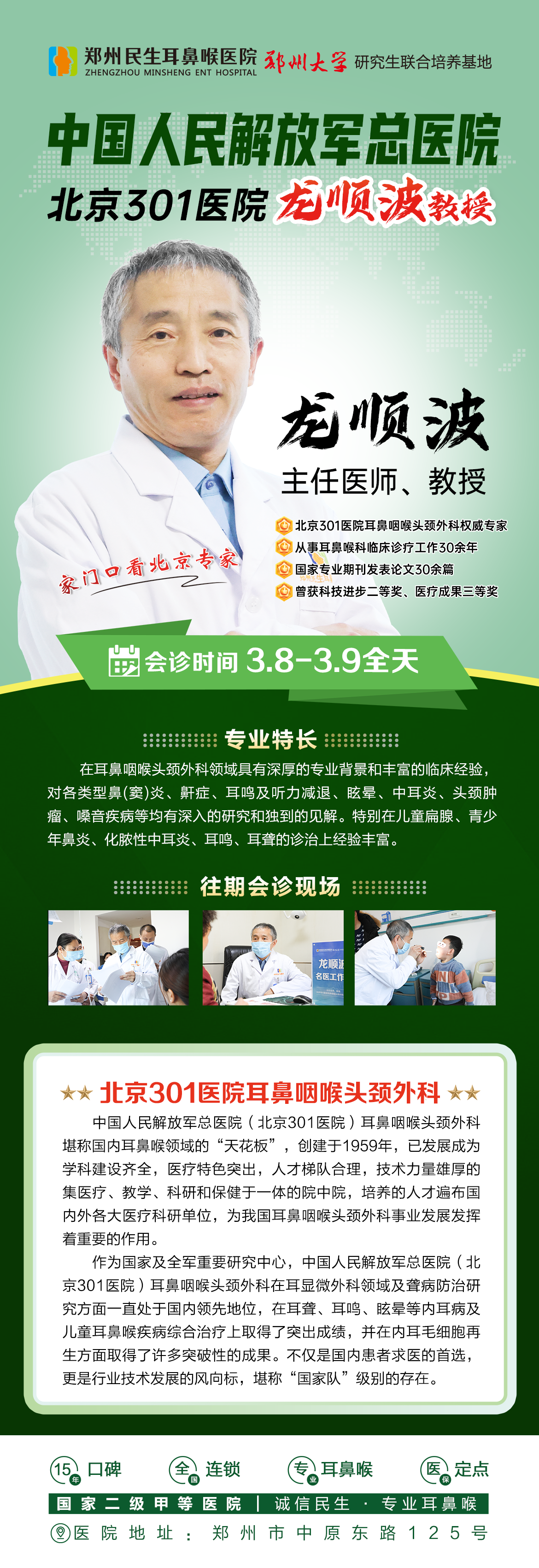 3月8-9日,北京301医院耳鼻喉科主任医师龙顺波教授亲临郑州民生耳鼻喉医院,为郑州及周边患者提供专业、高效的诊疗服务!